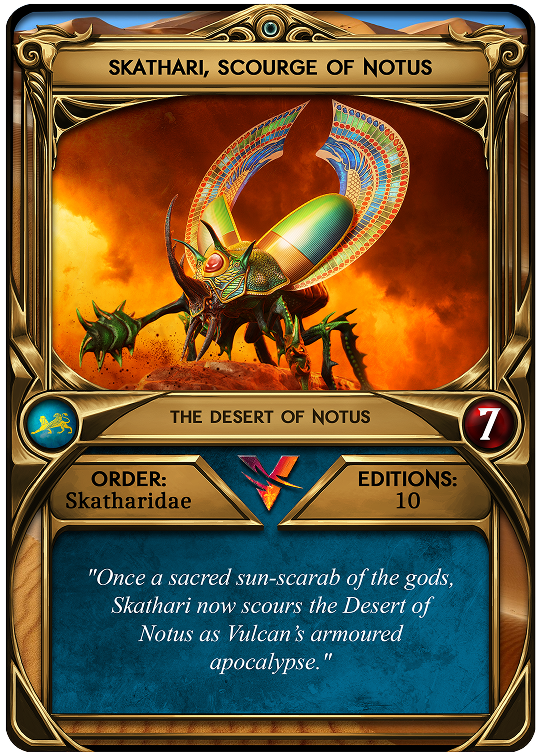 Once a sacred sun-scarab of the gods, Skathari now scours the Desert of Notus as Vulcan’s armoured apocalypse.